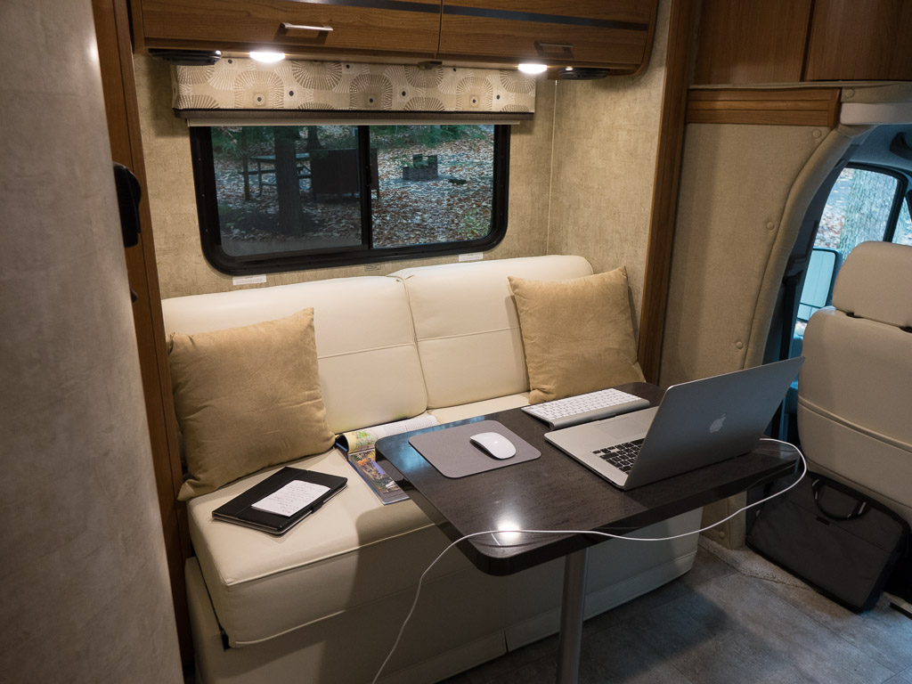 and the seating area, which required the front slideout to be extended and the table leg and table top to be retrieved from storage and set up whenever I wanted to use my laptop other than on my knees (and the process to be reversed again, as with the rear bed, to stow everything before I could drive on)